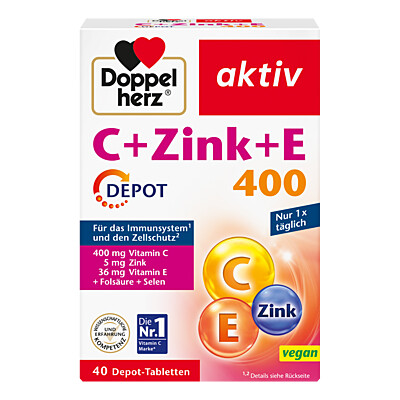 DOPPELHERZ C+Zink+E Depot Tabletten (40St)Einheit: 40 Tabletten Firma: QUEISSER PHARMA Kontaktdaten Kategorie: Nahrungsergänzungsmittel » Vitamine, Mineralstoffe, Vitalstoffe Bestellnummer (PZN): 2561607 PDF-Dokumente: