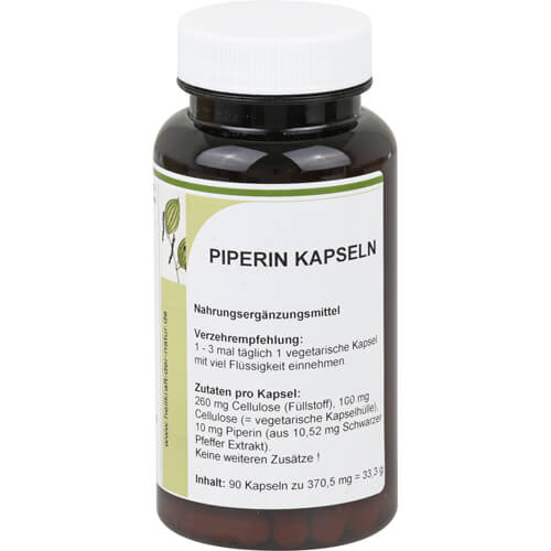 * Referenzmenge für die tägliche Zufuhr gemäß EU-Verordnung 1169/2011. ** Keine Angaben vorhanden. Zutaten pro Kapsel: 260 mg Cellulose (Füllstoff), 100 mg Cellulose (= vegetarische Kapselhülle), 10 mg Piperin (aus 10,52 mg Schwarzer Pfeffer Extrakt). Allergene: keine Nettofüllmenge: 90 Kapseln = 33,3 g Aufbewahrungsbedingungen: Trocken aufbewahren. Ursprungsland des Lebensmittels: Deutschland Anschrift des Herstellers: Reinhildis-Apotheke Inhaberin: Annette Herting Heinrich-Niemeyer-Str. 11 48477 Hörstel-Riesenbeck Weitere Hinweise: Geprüfte und zertifizierte Rohstoffe. Ohne Zucker, Lactose, Gluten, Konservierungsstoffe, Aromen, synthetische Farbstoffe, Magnesiumstearat oder Trennmittel. Die angegebene empfohlene tägliche Verzehrsmenge darf nicht überschritten werden. Nahrungsergänzungsmittel sind kein Ersatz für eine ausgewogene und abwechslungsreiche Ernährung und gesunde Lebensweise. Für kleine Kinder unzugänglich aufbewahren. Quelle: www.heilkraft-der-natur.de |