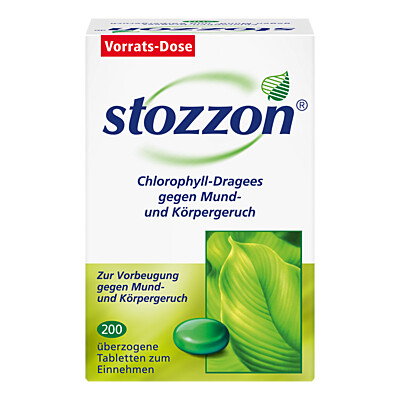 1. WAS SIND STOZZON CHLOROPHYLL-DRAGEES GEGEN MUND- UND KÖRPERGERUCH UND WOFÜR WERDEN SIE ANGEWENDET? stozzon Chlorophyll-Dragees gegen Mund- und Körpergeruch sind ein traditionelles Arzneimittel. Anwendungsgebiete: Traditionell angewendet zur Vorbeugung gegen Mund- und Körpergeruch. Beim Auftreten von Krankheitszeichen sollte ein Arzt aufgesucht werden. 2. WAS MÜSSEN SIE VOR DER EINNAHME VON STOZZON CHLOROPHYLL-DRAGEES GEGEN MUND-UND KÖRPERGERUCH BEACHTEN? stozzon Chlorophyll-Dragees gegen Mund- und Körpergeruch dürfen nicht angewendet werden, wenn Sie überempfindlich (allergisch) gegen den Wirkstoff oder einen der sonstigen Bestandteile sind. Besondere Vorsicht bei der Einnahme von stozzon Chlorophyll-Dragees gegen Mund- und Körpergeruch ist erforderlich: Dieses Arzneimittel enthält Sucrose und Lactose. Bitte nehmen Sie stozzon9 Chlorophyll-Dragees gegen Mund- und Körpergeruch erst nach Rücksprache mit Ihrem Arzt ein, wenn Ihnen bekannt ist, dass Sie unter einer Unverträglichkeit gegenüber bestimmten Zuckern leiden. Kinder: Da keine ausreichenden Untersuchungen vorliegen, sollen stozzon Chlorophyll-Dragees gegen Mund-und Körpergeruch nicht bei Kindern unter 12 Jahren angewendet werden. Bei Einnahme von stozzon Chlorophyll-Dragees gegen Mund- und Körpergeruch mit anderen Arzneimitteln: Bitte informieren Sie Ihren Arzt oder Apotheker, wenn Sie andere Arzneimittel einnehmen/anwenden bzw. vor kurzem eingenommen/angewendet haben, auch wenn es sich um nicht verschreibungspflichtige Arzneimittel handelt. Es sind keine Wechselwirkungen bekannt. Schwangerschaft und Stillzeit: Da keine ausreichenden Untersuchungen vorliegen, sollen stozzon9 Chlorophyll-Dragees gegen Mund- und Körpergeruch bei Schwangeren und während der Stillzeit nicht angewendet werden. Verkehrstüchtigkeit und das Bedienen von Maschinen Es sind keine besonderen Vorsichtsmaßnahmen erforderlich. 3. WIE SIND STOZZON CHLOROPHYLL-DRAGEES GEGEN MUND- UND KÖRPERGERUCH EINZUNEHMEN? Nehmen Sie stozzon Chlorophyll-Dragees gegen Mund- und Körpergeruch immer genau nach der Anweisung in dieser Packungsbeilage ein. Bitte fragen Sie bei Ihrem Arzt oder Apotheker nach, wenn Sie sich nicht ganz sicher sind. Falls vom Arzt nicht anders verordnet, ist die übliche Dosis: Mehrmals täglich 1 - 3 Dragees mit ausreichend Flüssigkeit einnehmen (nicht lutschen!), am besten zu den Mahlzeiten. Die Anwendungsdauer ist prinzipiell nicht begrenzt, beachten Sie jedoch die Angaben unter Anwendungsgebiete. 4. WELCHE NEBENWIRKUNGEN SIND MÖGLICH? Keine bekannt. Hinweis: In Einzelfällen kann eine unbedenkliche Grünfärbung des Stuhls auftreten. Meldung von Nebenwirkungen: Wenn Sie Nebenwirkungen bemerken, wenden Sie sich an Ihren Arzt oder Apotheker. Dies gilt auch für Nebenwirkungen, die nicht in dieser Packungsbeilage angegeben sind. Sie können Nebenwirkungen auch direkt dem Bundesinstitut für Arzneimittel und Medizinprodukte, Abt. Pharmakovigilanz, Kurt-Georg-Kiesinger-Allee 3, D-53175 Bonn, Website: www.bfarm.de anzeigen. Indem Sie Nebenwirkungen melden, können Sie dazu beitragen, dass mehr Informationen über die Sicherheit dieses Arzneimittels zur Verfügung gestellt werden. 5. WIE SIND STOZZON CHLOROPHYLL-DRAGEES GEGEN MUND- UND KÖRPERGERUCH AUFZUBEWAHREN? Arzneimittel für Kinder unzugänglich aufbewahren. Sie dürfen das Arzneimittel nach dem auf der Faltschachtel, der Durchdrückfolie bzw. dem Etikett angegebenen Verfalldatum (\"verwendbar bis\") nicht mehr verwenden. Das Verfalldatum bezieht sich auf den letzten Tag des Monats. Aufbewahrungsbedingungen: Nicht über 30°C aufbewahren. Hinweis auf Haltbarkeit nach Anbruch: Haltbarkeit nach Anbruch 3 Monate (die zeitliche Begrenzung gilt nur für die Dose). 6. WEITERE INFORMATIONEN Was stozzon Chlorophyll-Dragees gegen Mund- und Körpergeruch enthalten: Der Wirkstoff ist: Chlorophyllin-Kupfer-Komplex, Natriumsalz 20 mg. Die sonstigen Bestandteile sind: Cellulosepulver, Lactose-Monohydrat, Wasserfreie Lactose, Pfefferminzöl, Hochdisperses Siliciumdioxid, Magnesiumstearat, Schellack, Natives Rizinusöl, Talkum, Calciumcarbonat, Sucrose (Saccharose), Sprühgetrocknetes Arabisches Gummi, Macrogol 6000, Povidon, Carnaubawachs, Farbstoffe E 171, E 132 und E 104. Hinweis für Diabetiker: 1 überzogene Tablette entspricht 0,02 BE (Broteinheiten). Wie stozzon Chlorophyll-Dragees gegen Mund- und Körpergeruch aussehen und Inhalt der Packung: stozzon Chlorophyll-Dragees gegen Mund- und Körpergeruch sind in Packungen mit 40, 100 bzw. 200 überzogenen Tabletten erhältlich. Pharmazeutischer Unternehmer und Hersteller: Queisser Pharma GmbH & Co. KG Schleswiger Str. 74 D-24941 Flensburg Telefon 04 61/99 96-0 Telefax 04 61/99 96-110 Diese Gebrauchsinformation wurde zuletzt überarbeitet im Januar 2015. Quelle: Angaben der Packungsbeilage Anwendungsgebiete: zur Vorbeugung gegen Mund- und Körpergeruch. |