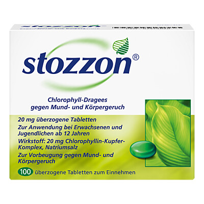 1. WAS SIND STOZZON CHLOROPHYLL-DRAGEES GEGEN MUND- UND KÖRPERGERUCH UND WOFÜR WERDEN SIE ANGEWENDET? stozzon Chlorophyll-Dragees gegen Mund- und Körpergeruch sind ein traditionelles Arzneimittel. Anwendungsgebiete: Traditionell angewendet zur Vorbeugung gegen Mund- und Körpergeruch. Beim Auftreten von Krankheitszeichen sollte ein Arzt aufgesucht werden. 2. WAS MÜSSEN SIE VOR DER EINNAHME VON STOZZON CHLOROPHYLL-DRAGEES GEGEN MUND-UND KÖRPERGERUCH BEACHTEN? stozzon Chlorophyll-Dragees gegen Mund- und Körpergeruch dürfen nicht angewendet werden, wenn Sie überempfindlich (allergisch) gegen den Wirkstoff oder einen der sonstigen Bestandteile sind. Besondere Vorsicht bei der Einnahme von stozzon Chlorophyll-Dragees gegen Mund- und Körpergeruch ist erforderlich: Dieses Arzneimittel enthält Sucrose und Lactose. Bitte nehmen Sie stozzon9 Chlorophyll-Dragees gegen Mund- und Körpergeruch erst nach Rücksprache mit Ihrem Arzt ein, wenn Ihnen bekannt ist, dass Sie unter einer Unverträglichkeit gegenüber bestimmten Zuckern leiden. Kinder: Da keine ausreichenden Untersuchungen vorliegen, sollen stozzon Chlorophyll-Dragees gegen Mund-und Körpergeruch nicht bei Kindern unter 12 Jahren angewendet werden. Bei Einnahme von stozzon Chlorophyll-Dragees gegen Mund- und Körpergeruch mit anderen Arzneimitteln: Bitte informieren Sie Ihren Arzt oder Apotheker, wenn Sie andere Arzneimittel einnehmen/anwenden bzw. vor kurzem eingenommen/angewendet haben, auch wenn es sich um nicht verschreibungspflichtige Arzneimittel handelt. Es sind keine Wechselwirkungen bekannt. Schwangerschaft und Stillzeit: Da keine ausreichenden Untersuchungen vorliegen, sollen stozzon9 Chlorophyll-Dragees gegen Mund- und Körpergeruch bei Schwangeren und während der Stillzeit nicht angewendet werden. Verkehrstüchtigkeit und das Bedienen von Maschinen Es sind keine besonderen Vorsichtsmaßnahmen erforderlich. 3. WIE SIND STOZZON CHLOROPHYLL-DRAGEES GEGEN MUND- UND KÖRPERGERUCH EINZUNEHMEN? Nehmen Sie stozzon Chlorophyll-Dragees gegen Mund- und Körpergeruch immer genau nach der Anweisung in dieser Packungsbeilage ein. Bitte fragen Sie bei Ihrem Arzt oder Apotheker nach, wenn Sie sich nicht ganz sicher sind. Falls vom Arzt nicht anders verordnet, ist die übliche Dosis: Mehrmals täglich 1 - 3 Dragees mit ausreichend Flüssigkeit einnehmen (nicht lutschen!), am besten zu den Mahlzeiten. Die Anwendungsdauer ist prinzipiell nicht begrenzt, beachten Sie jedoch die Angaben unter Anwendungsgebiete. 4. WELCHE NEBENWIRKUNGEN SIND MÖGLICH? Keine bekannt. Hinweis: In Einzelfällen kann eine unbedenkliche Grünfärbung des Stuhls auftreten. Meldung von Nebenwirkungen: Wenn Sie Nebenwirkungen bemerken, wenden Sie sich an Ihren Arzt oder Apotheker. Dies gilt auch für Nebenwirkungen, die nicht in dieser Packungsbeilage angegeben sind. Sie können Nebenwirkungen auch direkt dem Bundesinstitut für Arzneimittel und Medizinprodukte, Abt. Pharmakovigilanz, Kurt-Georg-Kiesinger-Allee 3, D-53175 Bonn, Website: www.bfarm.de anzeigen. Indem Sie Nebenwirkungen melden, können Sie dazu beitragen, dass mehr Informationen über die Sicherheit dieses Arzneimittels zur Verfügung gestellt werden. 5. WIE SIND STOZZON CHLOROPHYLL-DRAGEES GEGEN MUND- UND KÖRPERGERUCH AUFZUBEWAHREN? Arzneimittel für Kinder unzugänglich aufbewahren. Sie dürfen das Arzneimittel nach dem auf der Faltschachtel, der Durchdrückfolie bzw. dem Etikett angegebenen Verfalldatum (\"verwendbar bis\") nicht mehr verwenden. Das Verfalldatum bezieht sich auf den letzten Tag des Monats. Aufbewahrungsbedingungen: Nicht über 30°C aufbewahren. Hinweis auf Haltbarkeit nach Anbruch: Haltbarkeit nach Anbruch 3 Monate (die zeitliche Begrenzung gilt nur für die Dose). 6. WEITERE INFORMATIONEN Was stozzon Chlorophyll-Dragees gegen Mund- und Körpergeruch enthalten: Der Wirkstoff ist: Chlorophyllin-Kupfer-Komplex, Natriumsalz 20 mg. Die sonstigen Bestandteile sind: Cellulosepulver, Lactose-Monohydrat, Wasserfreie Lactose, Pfefferminzöl, Hochdisperses Siliciumdioxid, Magnesiumstearat, Schellack, Natives Rizinusöl, Talkum, Calciumcarbonat, Sucrose (Saccharose), Sprühgetrocknetes Arabisches Gummi, Macrogol 6000, Povidon, Carnaubawachs, Farbstoffe E 171, E 132 und E 104. Hinweis für Diabetiker: 1 überzogene Tablette entspricht 0,02 BE (Broteinheiten). Wie stozzon Chlorophyll-Dragees gegen Mund- und Körpergeruch aussehen und Inhalt der Packung: stozzon Chlorophyll-Dragees gegen Mund- und Körpergeruch sind in Packungen mit 40, 100 bzw. 200 überzogenen Tabletten erhältlich. Pharmazeutischer Unternehmer und Hersteller: Queisser Pharma GmbH & Co. KG Schleswiger Str. 74 D-24941 Flensburg Telefon 04 61/99 96-0 Telefax 04 61/99 96-110 Diese Gebrauchsinformation wurde zuletzt überarbeitet im Januar 2015. Quelle: Angaben der Packungsbeilage Anwendungsgebiete: zur Vorbeugung gegen Mund- und Körpergeruch. |